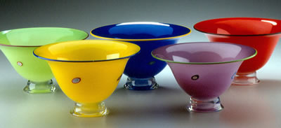 Blown glass bowls. Pictured from left to right : Wasabe Green, Yellow, Lapiz Blue, Lavender, Red.